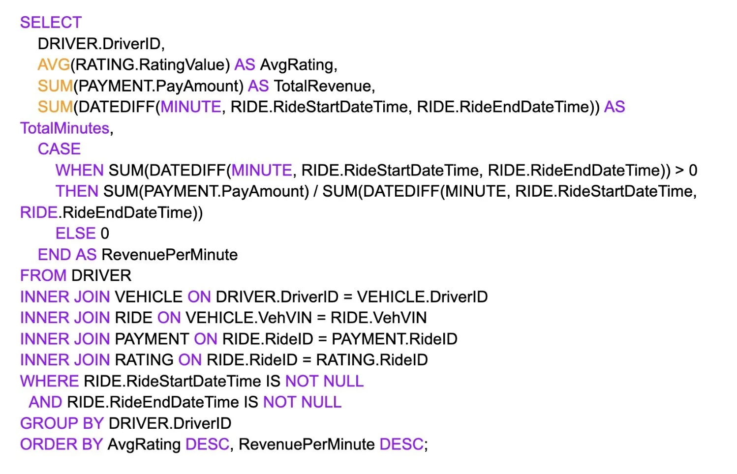 This project was implemented using SQL to analyze FastTrack Rides’ operational data. Each research question was answered with a dedicated query that extracted insights from the ride, driver, and payment tables. Below are selected SQL queries that demonstrate the technical process. Full code for all questions is available in the attached project PDF.